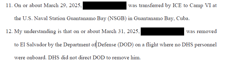 And what the accompanying ICE official’s affidavit makes clear is that the DHS was directly involved in their removal. That’s because DHS had custody of several of the individuals after the court’s order, and then transferred them to DOD after the court’s order. Indeed, DHS apparently transferred some individuals to the DOD base in Guantanamo. The base served as a very temporary holding place until their transportation by DOD to El Salvador a few days later. Here’s an example from the affidavit: