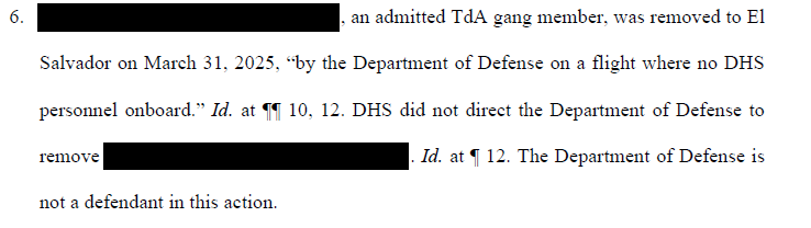 The government now says it did remove these individuals to El Salvador after the court’s order! The government’s excuse: The removal to El Salvador was carried out by the Department of Defense (DOD) rather than DHS/ICE, and the former is not a named defendant in the case. An example from the government’s Wednesday night filing: